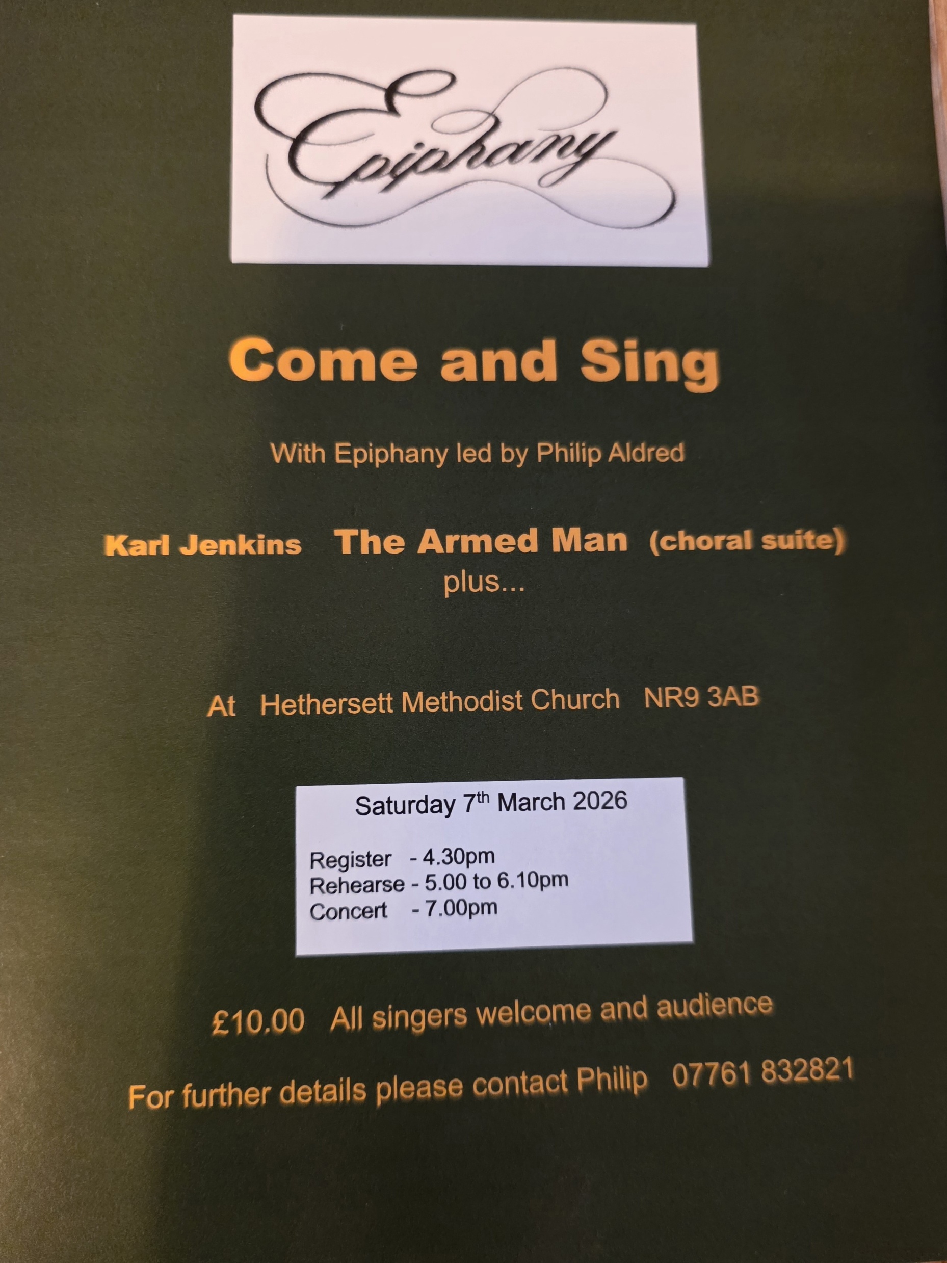 Come and Sing with Epiphany Led by Philip Aldred Karl Jenkins   The Armed Man.  (choral suite) plus... Register 4.30pm Rehearse 5-6.10pm Concert 7pm ALL SINGERS WELCOME For more information […]